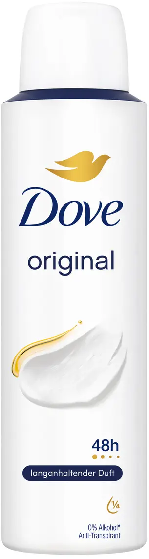 Di adiós a las axilas húmedas y los olores corporales desagradables con el desodorante en aerosol original de Dove. Este producto ofrece una protección fiable durante 48 horas. Una fórmula nutritiva con ¼ de humectante deja las axilas suaves y sedosas.