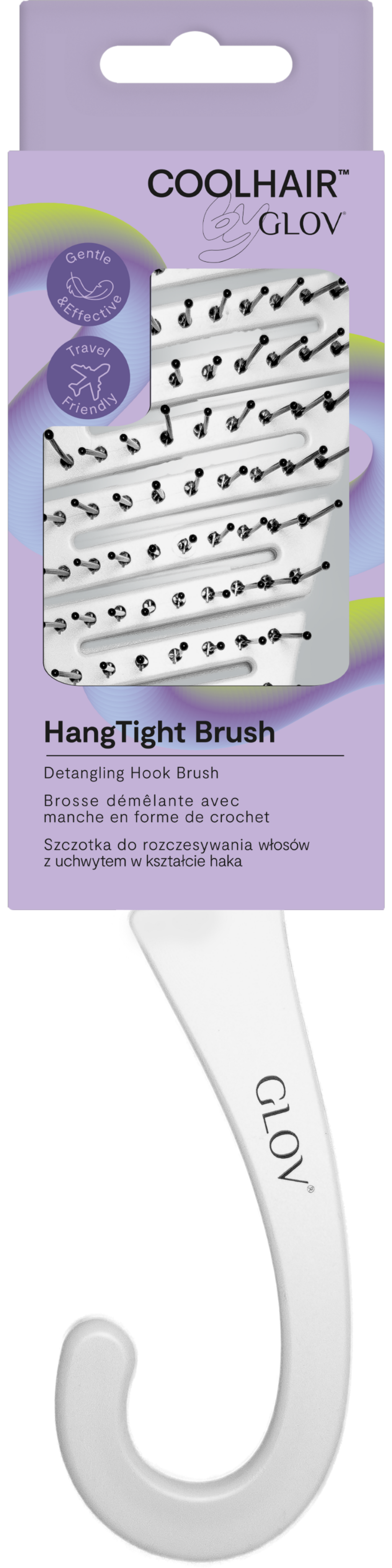 El cepillo HangTight Brush cuenta con cerdas flexibles con puntas redondeadas que se deslizan con especial suavidad por el cabello, desenredándolo sin esfuerzo y sin dolor. El mango ergonómico garantiza un agarre seguro, mientras que su forma de gancho permite colgarlo cómodamente en la barra de la ducha, el toallero o un gancho del baño.