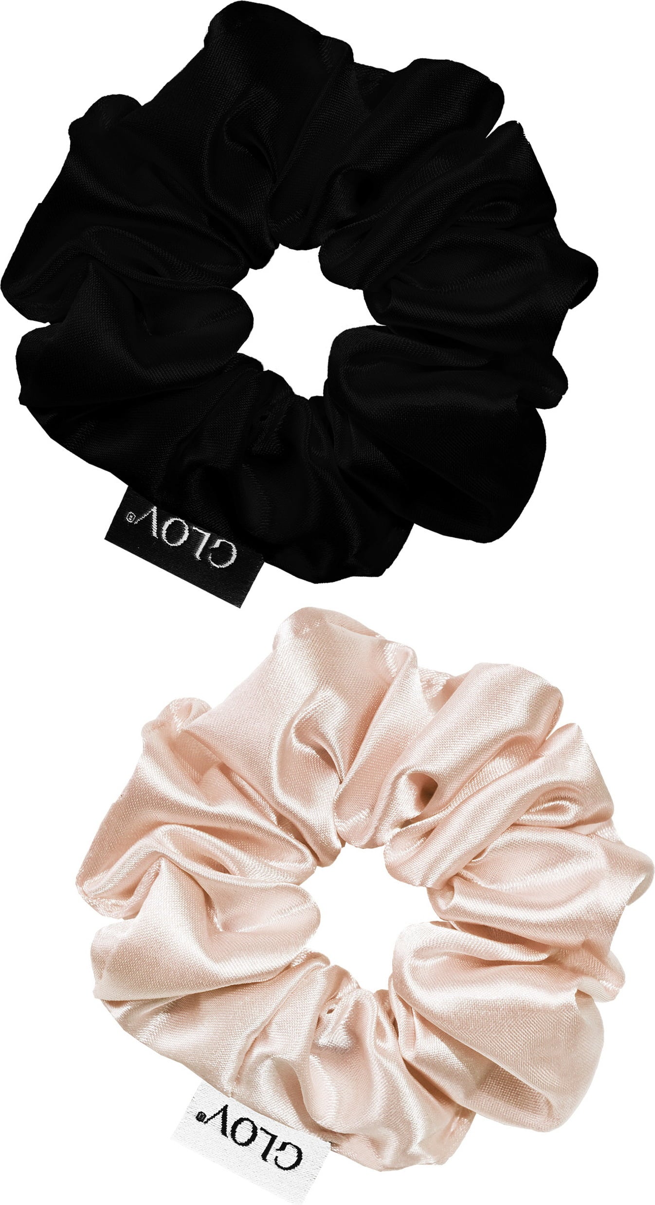 Estos bonitos scrunchies de satén de poliéster moldean tu pelo sin esfuerzo y son respetuosos con las fibras capilares. Este set contiene 2 coleteros de la talla S en 2 colores diferentes.