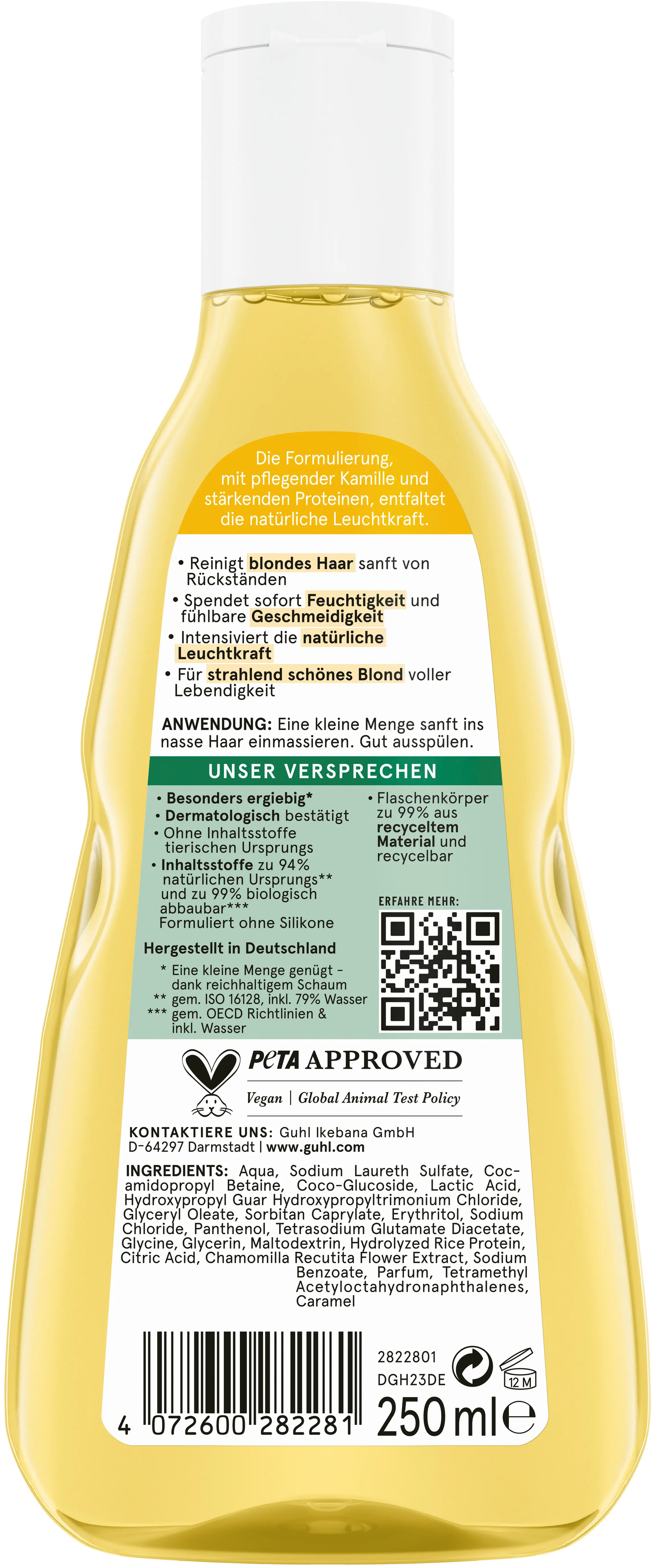 Este champú limpia suave y eficazmente el cabello rubio y le aporta luminosidad. Hidrata y nutre el cabello con ingredientes naturales como la camomila y las proteínas.