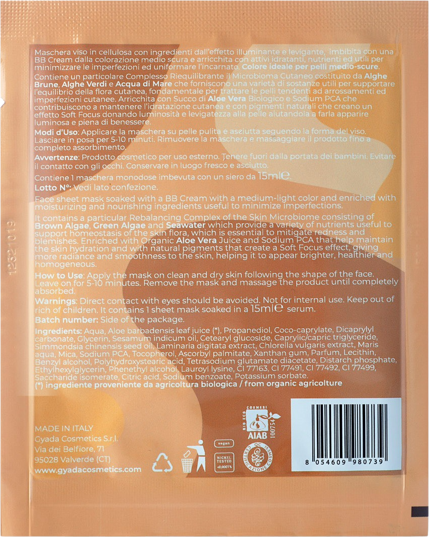 Las BB Masks de GYADA son mascarillas en láminas de celulosa impregnadas de sérum. Proporcionan a la piel hidratación, agentes nutritivos y una apariencia uniforme. El complejo de ingredientes activos compuestos de algas pardas, chlorella y sal marina tiene un efecto de reequilibrio y apoya la flora de la piel. El aloe vera y el PCA de sodio reponen los niveles de hidratación de la piel al contrarrestar los signos del envejecimiento de la piel. Los pigmentos naturales proporcionan un efecto soft-focus para una tez brillante.