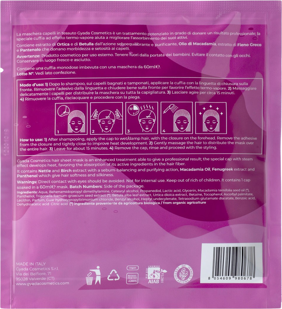 Esta máscara de gafas de GYADA ofrece atención profesional para todo tipo de cabello. Su formulación contiene extractos equilibrantes y clarificadores de ortiga y abedul, que pueden ser absorbidos de manera óptima por el efecto del calor. Al mismo tiempo, el aceite de macadamia, los extractos de semillas de fenogreco y el pantenol aseguran flexibilidad y sedosidad.