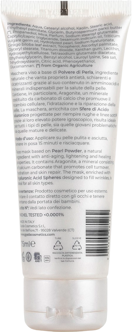 Esta mascarilla facial especial es adecuada tanto para pieles jóvenes y problemáticas como para pieles maduras y sensibles. Su formulación contiene polvo de perla preciosa rica en aminoácidos, minerales y aragonito. Este último es un mineral compuesto por carbonato de calcio y garantiza una excelente hidratación. El polvo de perla también cuenta con propiedades antienvejecimiento, cicatrizantes y aclarantes. La mascarilla también contiene ácido hialurónico con efecto redensificante.