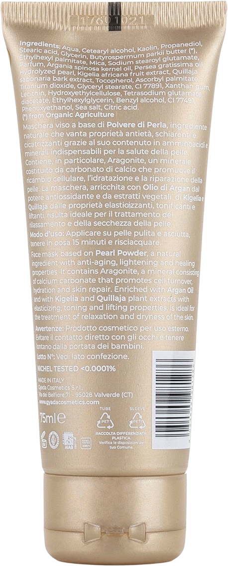 Esta mascarilla facial se caracteriza por una textura suave y cremosa y una rica formulación, perfecta para pieles secas y maduras. El producto es fácil de aplicar y quitar. Su formulación contiene polvo de perla rico en aminoácidos y minerales con propiedades antiedad, y aragonito, un mineral compuesto por carbonato de calcio, con efecto regenerador e hidratante. Enriquecida con aceite de argán rico en antioxidantes y extractos de kigelia y quillaja, la mascarilla favorece la elasticidad de la piel y asegura una tez más uniforme.