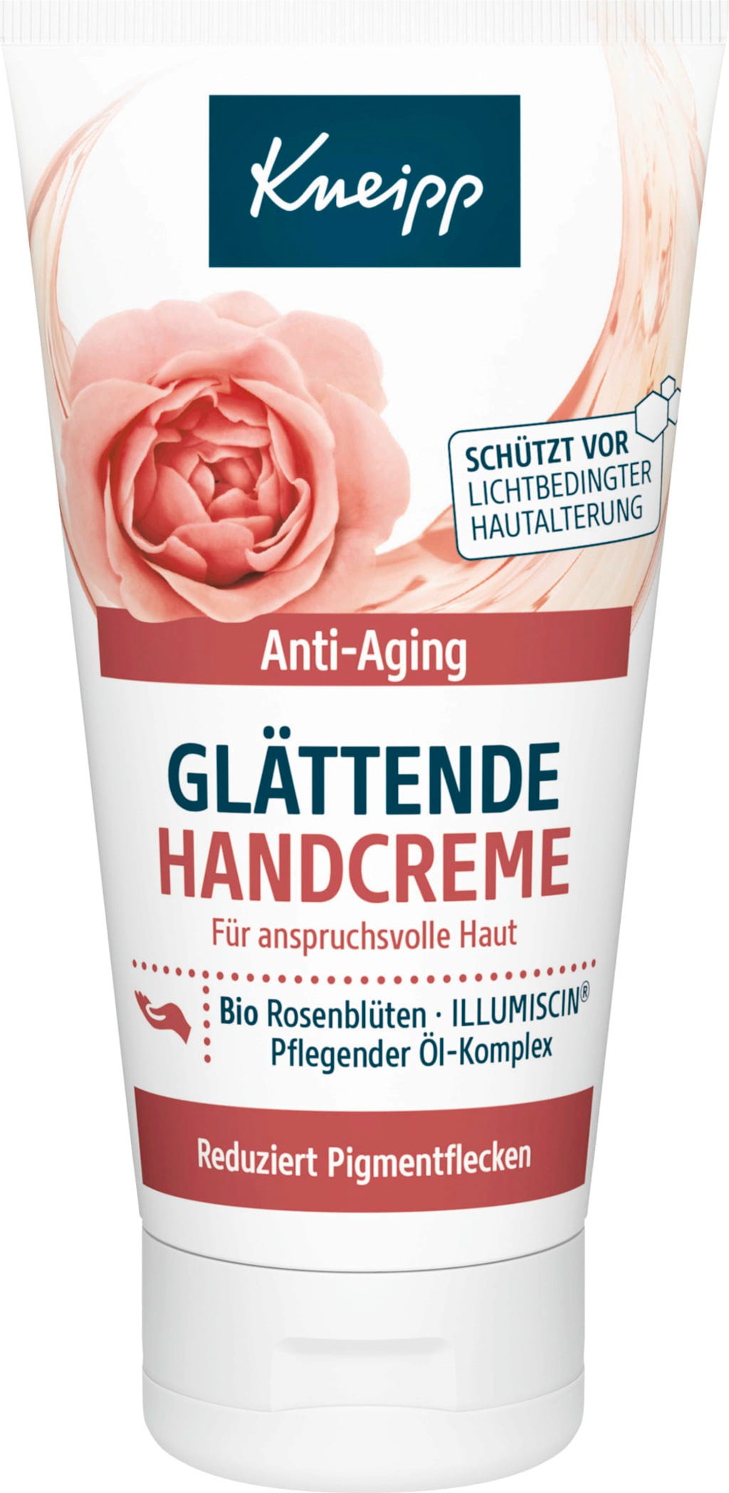La crema de manos suavizante de Kneipp proporciona un cuidado intenso con efecto antiedad para las manos. Su textura con extracto orgánico de pétalos de rosa y un complejo de aceites vegetales de karité, argán y jojoba hidrata y mima intensamente la piel. El complejo especial ILLUMISCIN® también está diseñado para cuidar de forma óptima la piel con manchas pigmentarias visibles. Para una piel agradablemente suave y sin sensación grasa.