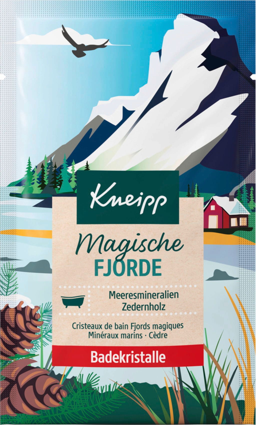 Con los cristales de baño Kneipp Magical Fjords, te transportarás a las majestuosas extensiones de los fiordos nórdicos. Mientras te sumerges en el baño, el agua adquiere un radiante color azul verdoso y te invita a desconectar por un momento y dejar vagar tu mente. La combinación de minerales marinos y aceite esencial de cedro crea un perfil de fragancia agradablemente claro que recuerda al aire fresco del mar. Estos cristales de baño son tu pequeño descanso lleno de sensaciones naturales. La formulación es vegana. El contenido de un envase es suficiente para un baño completo.