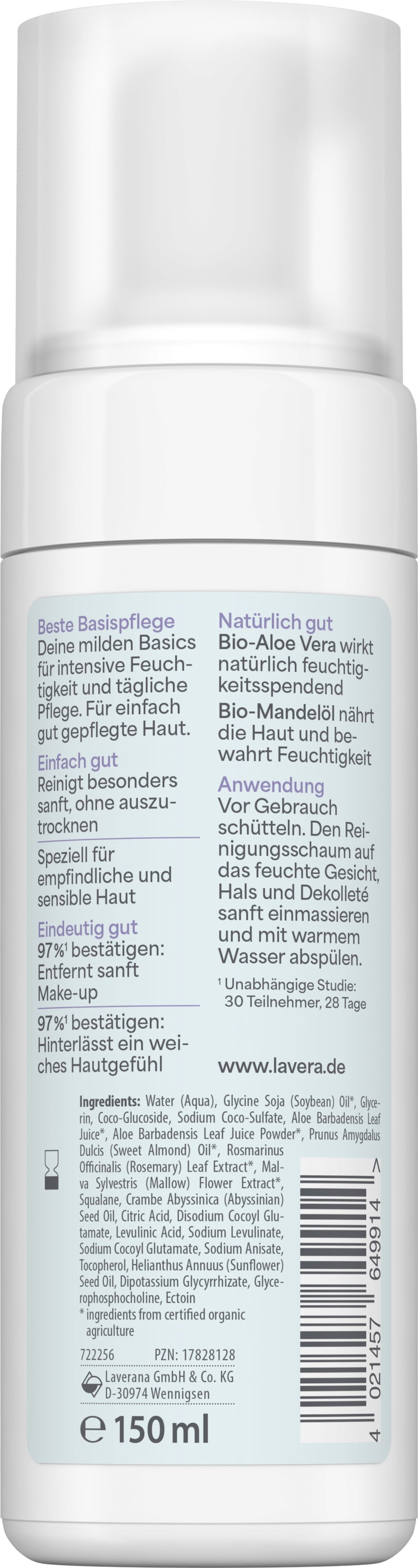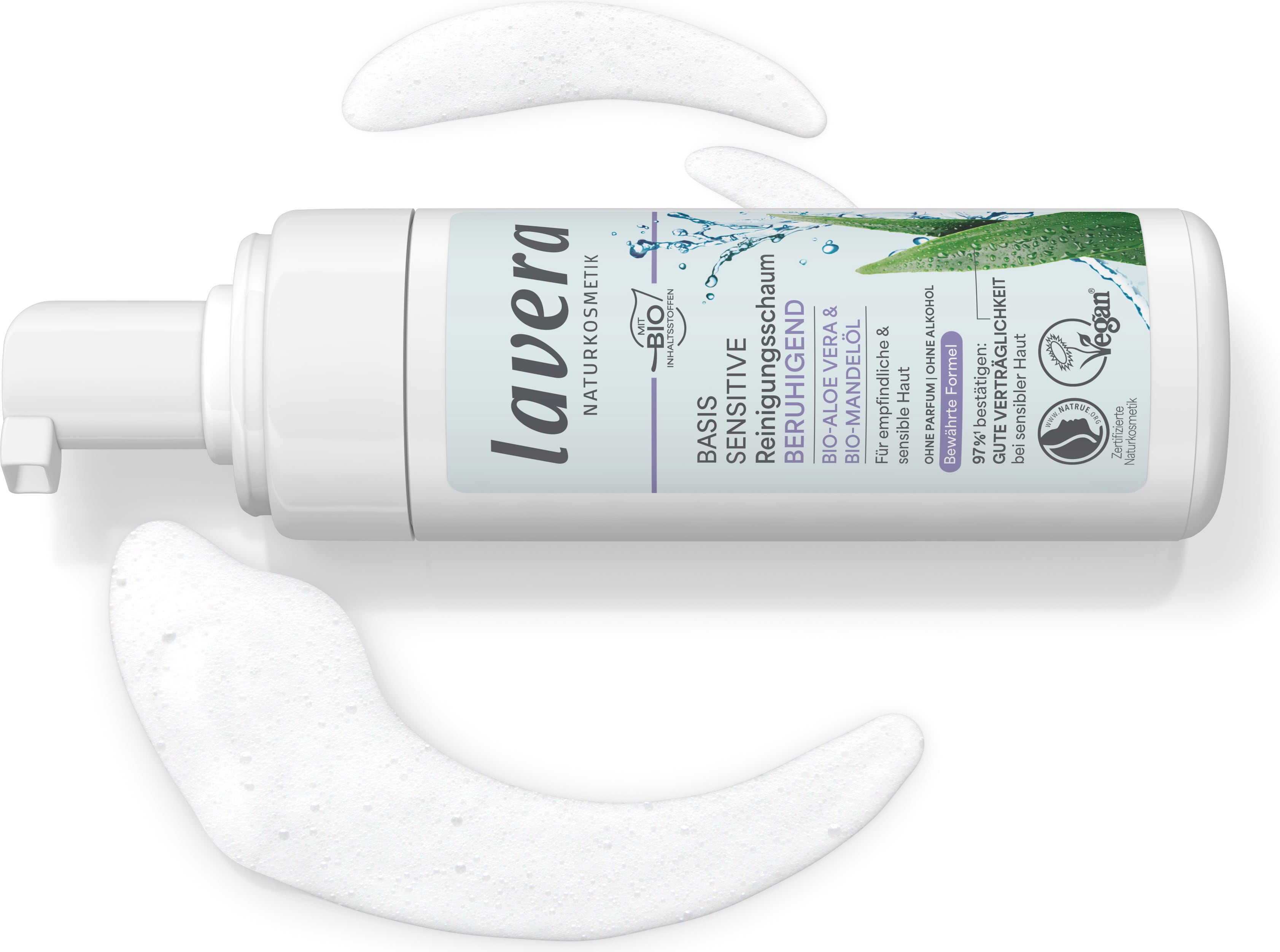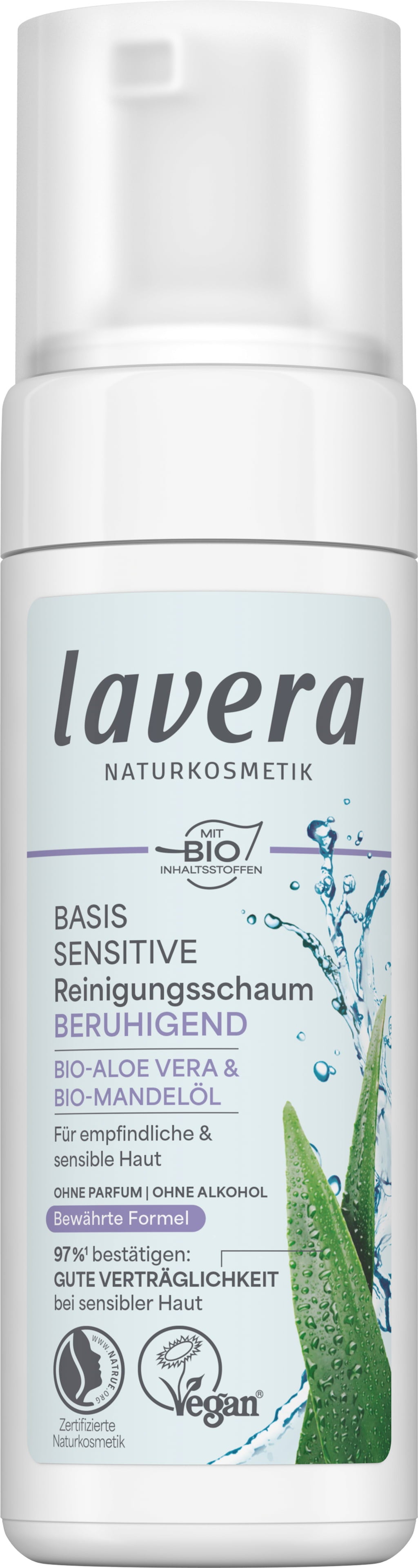 La espuma limpiadora de lavera también cuida la piel sensible y la limpia de nuevo. El aloe vera orgánico y el aceite de almendras orgánico aportan propiedades regeneradoras e hidratantes y evocan una tez limpia.