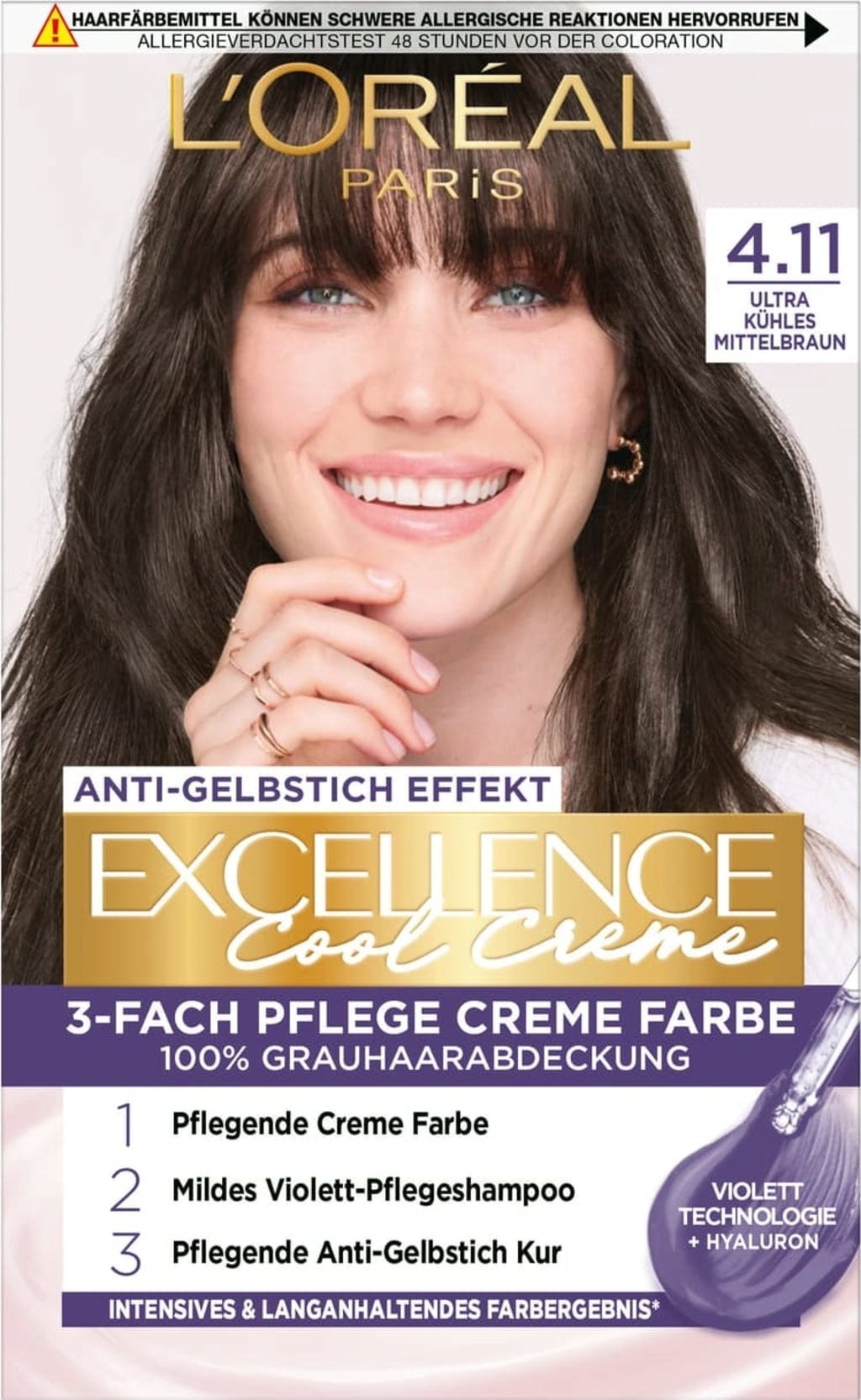L'ORÉAL PARIS EXCELLENCE Cool Creme - Coloración Permanente Anti-Amarillo, 4.11 Castaño Ultra Frío