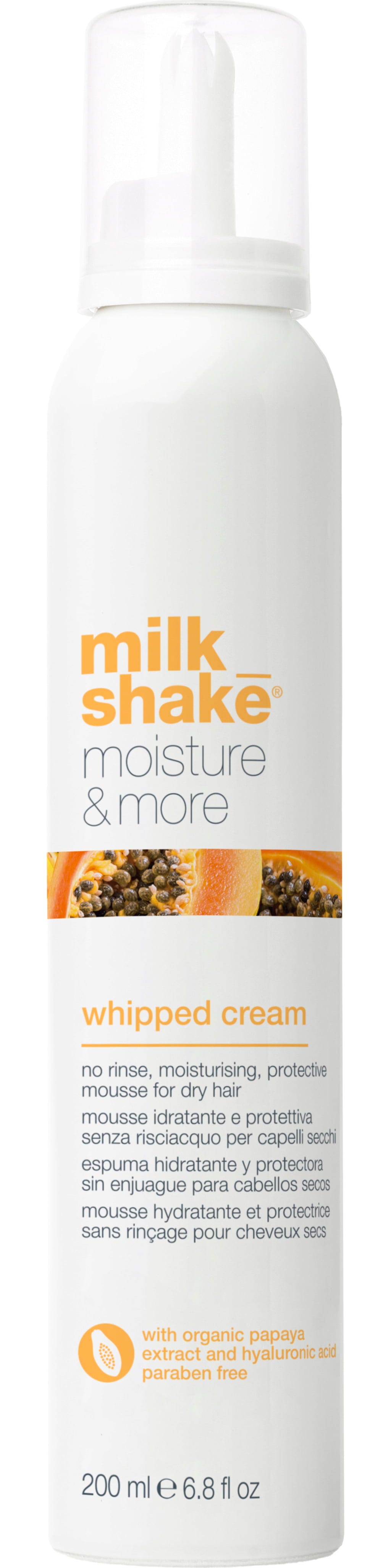 Moisture & More Whipped Cream de milk_shake es una espuma hidratante sin aclarado ultraligera que aporta flexibilidad instantánea al cabello seco. Su fórmula con ácido hialurónico y extracto de papaya ayuda a equilibrar la hidratación y suavizar notablemente el cabello. La niacinamida favorece un efecto acondicionador suavizante, dejando la superficie del cabello más suave y nutrida. Como tratamiento ideal previo al peinado, la espuma garantiza que el cabello se caiga con mayor facilidad, brille maravillosamente y esté óptimamente preparado para el peinado posterior.