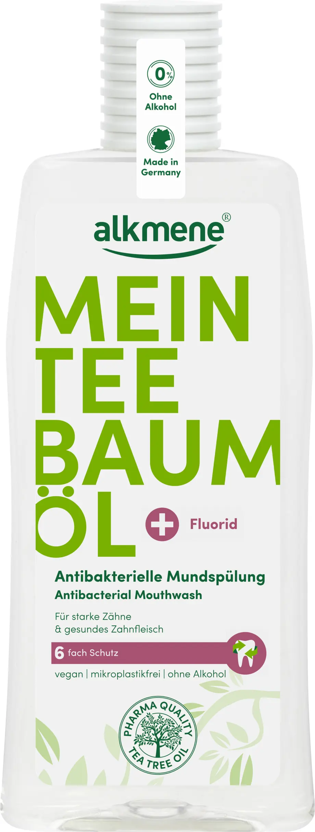 El enjuague bucal My Tea Tree Oil de alkmene refresca el aliento y proporciona una buena protección de las encías y de los ácidos del azúcar gracias al aceite del árbol del té y al flúor de su formulación. La formulación del enjuague bucal es vegana y no contiene microplásticos ni alcohol.