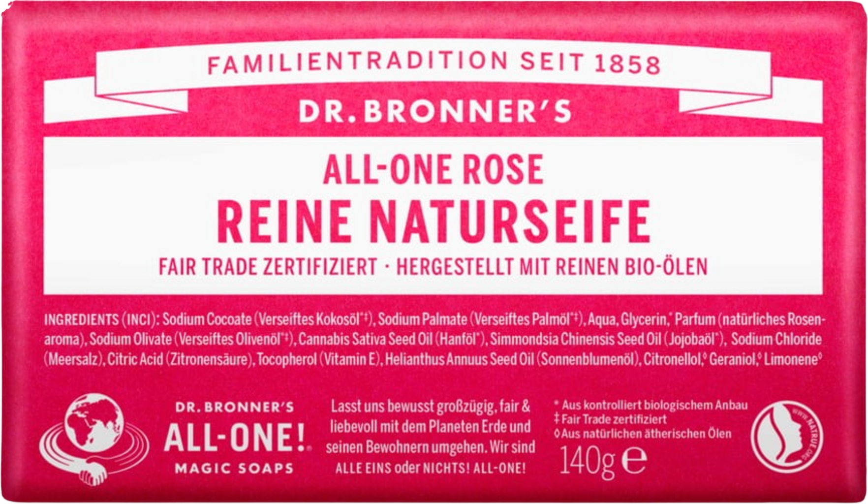 Sodium Cocoate[1], Sodium Palmate (Palm Soap)[1], Aqua, Sodium Olivate[1], Vegetable Glycerin, Sodium Hempate[1], Sodium Jojobate[2], Natural Rose Fragrance, Sodium Chloride, Citric Acid, Tocopherol (Vitamin E), Citral[3], Citronellal[3], Geraniol[3], D-Limonen[3], Linalool[3]