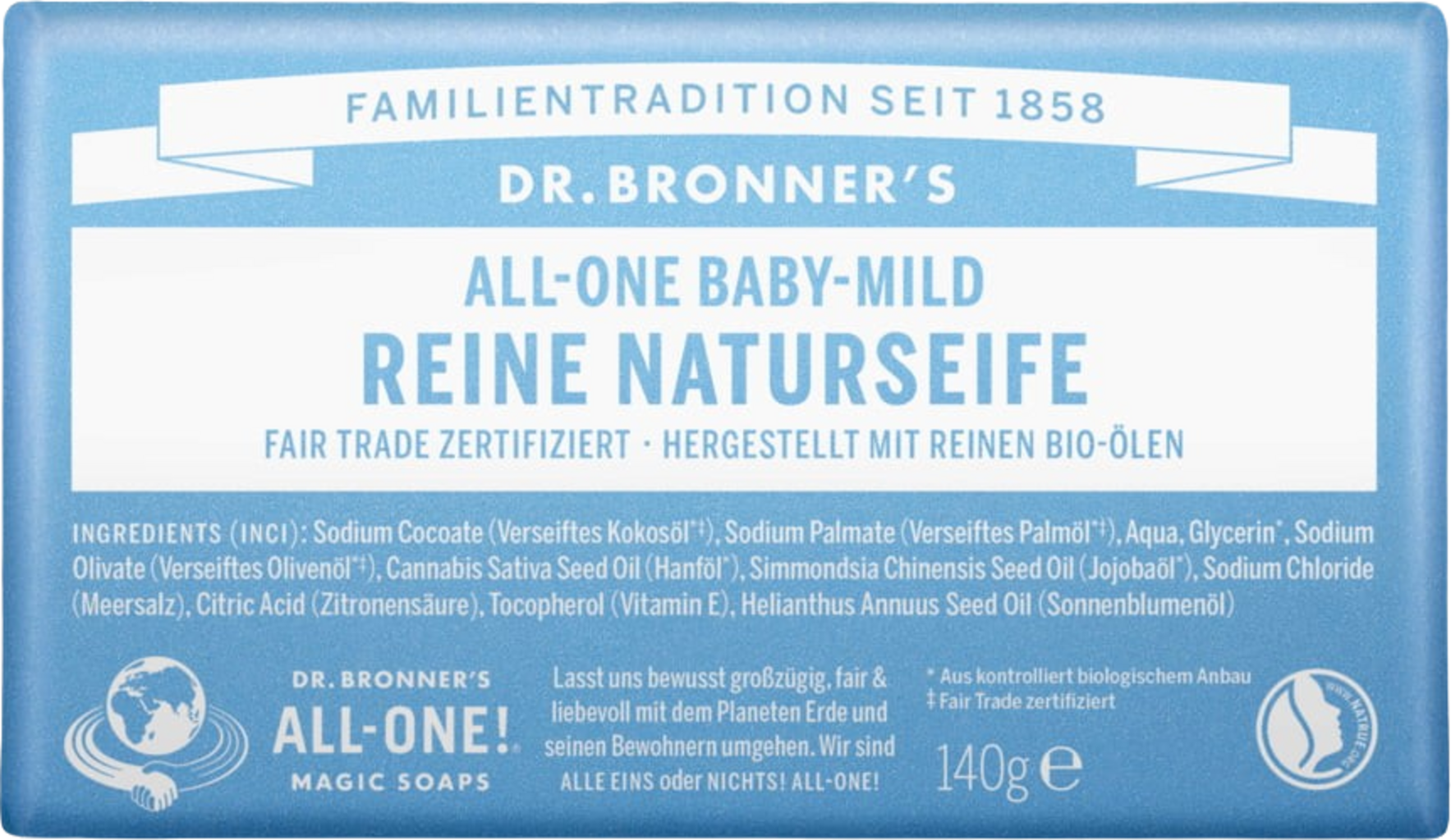 Los jabones Dr. Bronner´s contienen coco activo biológico, oliva, jojoba, cáñamo y aceites esenciales puros. Limpian suavemente y con eficacia. Producen una espuma aterciopelada que deja la piel suave como la seda. Los jabones han sido certificados por Oregon Tilth. Cumplen con los estándares del comercio justo y se inspeccionan regularmente por la empresa de certificación suiza OMI.
