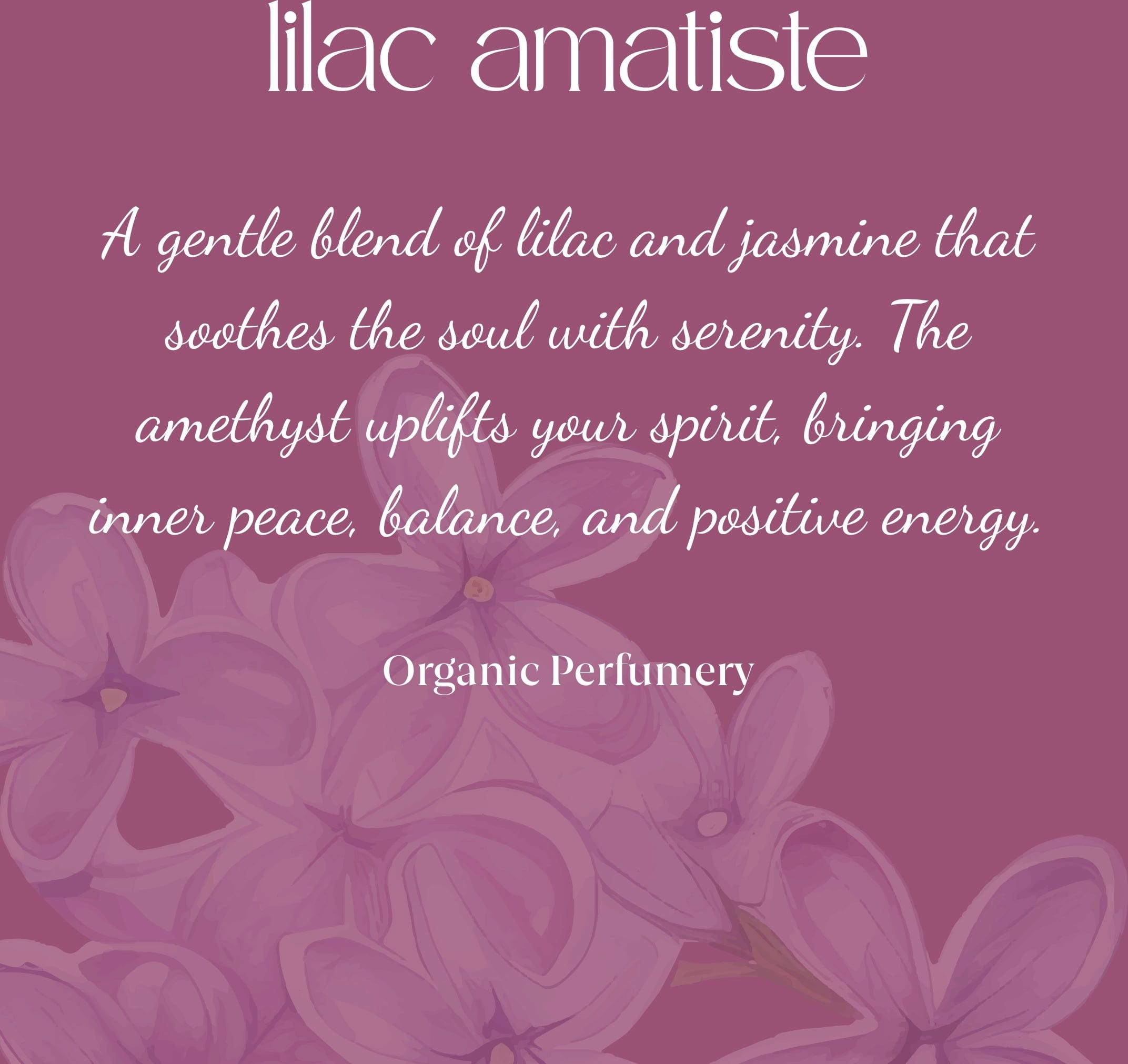 Una fragancia suave y radiante que envuelve el cuerpo y la energía con una sensación de calma, apertura y conexión y notas florales y verdes. Inspirada en la amatista, un mineral que te acompaña en momentos de introspección y serenidad, como un tranquilo paseo al amanecer.