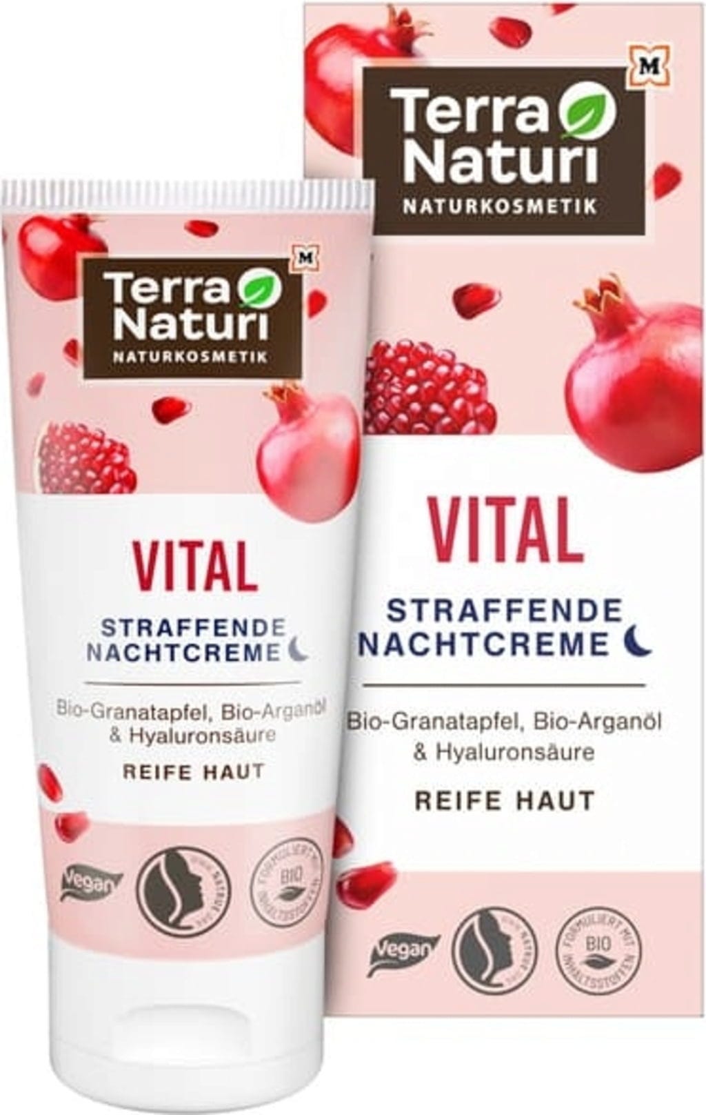La crema de noche reafirmante VITAL de Terra Naturi aporta a la piel madura un aspecto nutrido e hidratado desde la primera aplicación. Su fórmula vegana está enriquecida con extracto de granada ecológica, aceites valiosos y ácido hialurónico, proporcionando un cuidado intensivo y profundo.