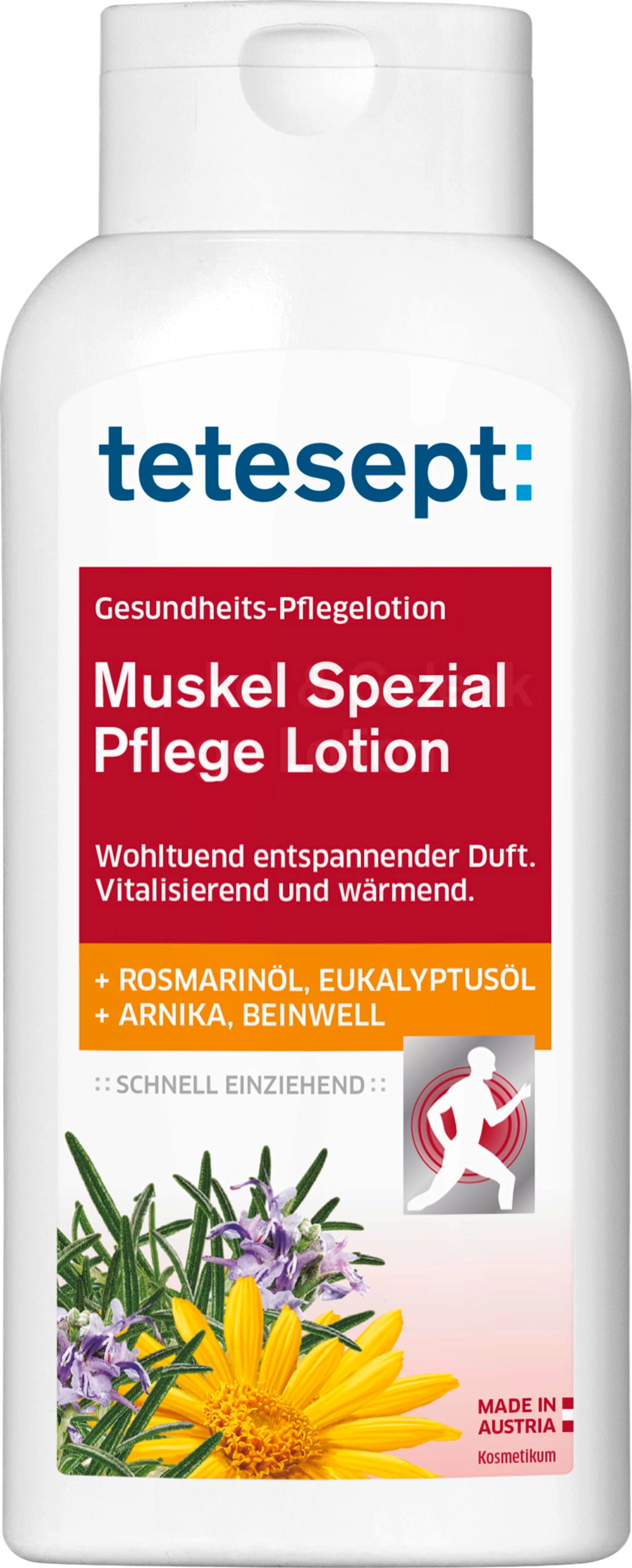 La Loción Especial para Músculos de tetesept con La fórmula patentada NutriBion® proporciona a los músculos un suave efecto calorífico. Es ideal para usar después del ejercicio físico o del esfuerzo físico.