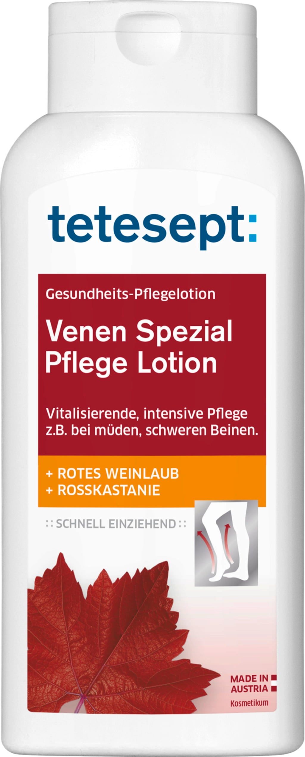 La Loción Especial para Piernas de tetesept contiene aceites esenciales y valiosos extractos vegetales y es ideal para quienes tienden a tener las piernas pesadas y cansadas. La loción nutritiva se absorbe rápidamente y convence por sus propiedades versátiles. Las hojas de vid roja que contiene son ricas en flavonoides, mientras que los extractos de castaño de indias contienen escina y pueden proporcionar un efecto revitalizante. El ingrediente final es el aceite esencial natural de melisa.